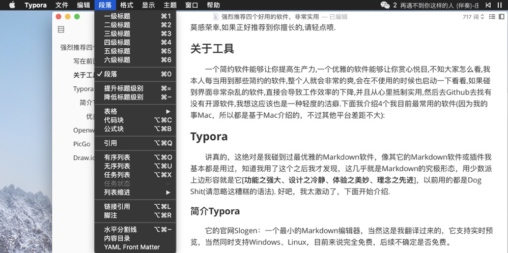 讲真的,这绝对是我碰到过最优雅的Markdown软件,像其它的Markdown软件或插件我基本都是用过,知道我用了这个之后我才发现,这几乎就是Markdown的究极形态,用少数派上边形容就是它[功能之强大、设计之冷静、体验之美妙、理念之先进],以前用的都是Dog Shit(请忽略这糟糕的语法). 好吧,我太激动了,下面开始介绍:
