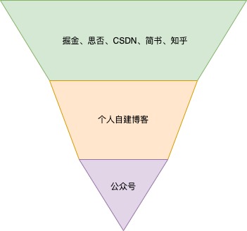上面基本是写博客基本会用到的平台,用户的流量会逐层层的向下过滤,逐渐的从流量平台沉淀到微信公众号,用户会越来越少,但少并不一定是坏事,因为留下的可以认为是用户粘性比较高的。