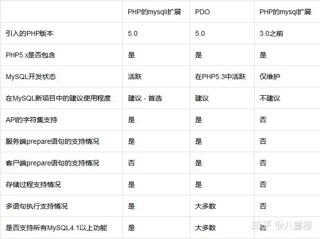 PHP的mysqli扩展,我们有时称之为MySQL增强扩展,可以用于使用 MySQL4.1.3或更新版本中新的高级特性。其特点为:面向对象接口 、prepared语句支持、多语句执行支持、事务支持 、增强的调试能力、嵌入式服务支持 、预处理方式完全解决了sql注入的问题。不过其也有缺点,就是只支持mysql数据库。如果你要是不操作其他的数据库,这无疑是最好的选择。