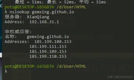 nslookup是我们最常用的命令之一,它是一个用来进行域名解析的命令,也可以实现DNS服务器的查询。用法如下(解析我的github域名):