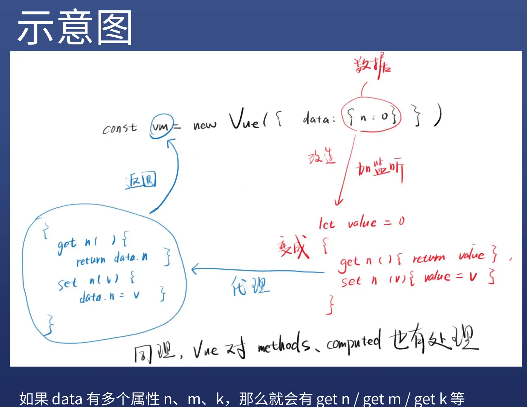 - 让vm成为myData的代理。使用的this就是vm,vm就是myData