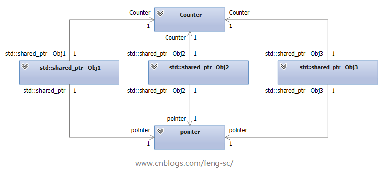 简单地说,智能指针只是用对象去管理一个资源指针,同时用一个计数器计算当前指针引用对象的个数,当管理指针的对象增加或减少时,计数器也相应加1或减1,当最后一个指针管理对象销毁时,计数器为1,此时在销毁指针管理对象的同时,也把指针管理对象所管理的指针进行delete操作。