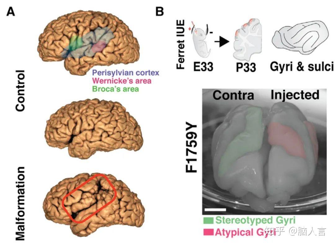利用这种生物的特性不仅可以研究正常的进化发育过程中的皮层折叠过程,而且还能用于相关脑疾病研究[4,5]。例如,有的孩子天生大脑皮层畸形,智力缺陷,这背后究竟是来自父母的遗传因素,还是自身的基因突变,亦或是后天的环境因素造成的?这些因素又是如何一步步地影响皮层的发育?往脑子里打一记相关基因敲除的“大脑除皱针”,给转基因的貂儿照一下脑部的MRI,再看看神经元的基因表达、形态,测一测神经元之间的联结功能还是否正常 … …研究者试图用种种方法,逼近这些科学难题的本质,而这些问题的解答一部分还得仰仗蒙眼貂这位小老弟了。例如,编码钠离子通道(Nav1.3)相关基因SCN3A在出生后如果持续表达,人类会形成大脑外侧裂区域多小脑回(polymicrogyria),即形成小而浅的脑褶,同时会表现为发音和口头表述的运动失常(与语言表达和理解相关的韦尼克区和布洛卡区包含于外侧裂)。该基因突变是如何影响外侧裂皮层折叠的过程呢?研究者就把高表达SCN3A的质粒注射入貂宝宝的脑中。这个质粒的效果就像是“大脑的除皱针”。等貂儿一个多月大的时候再用MRI看看,就能发现脑灰质部分明显的异位现象,原来正常皮层外表的沟沟坎坎变得光滑了不少。其中更深层的原因是什么?研究者发现了SCN3A基因持续表达后,貂儿皮层的细胞在皮层的生发区仍保留着大量的干细胞并且神经元迁移发生了障碍。[6] 你以为这是貂在神经科学的贡献全部,其实它能做的不止如此。