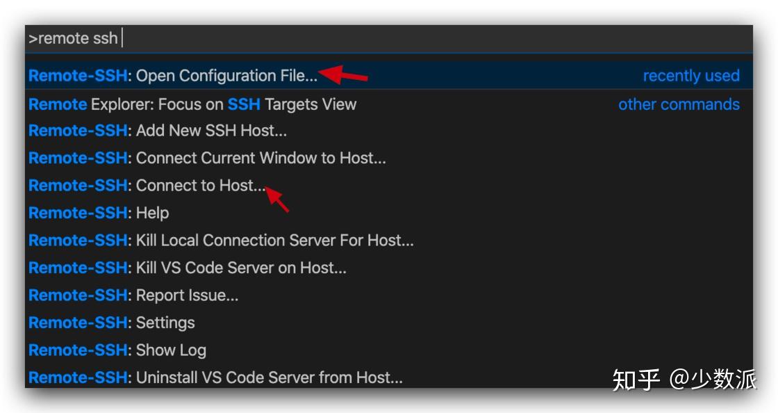 安装 Remote-SSH 插件后,打开命令面板搜索remote ssh。然后找到 Remote-SSH 相关命令,即可以直接选择链接服务器,也可以选择打开配置文件。这里,我们选择打开配置文件进行简单的配置。