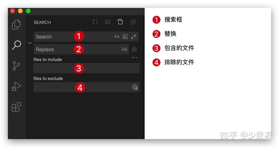 搜索支持三种模式,分别是区分大小写、全字匹配和正则表达式,例如 iOS 这类大小写的替换需要选择「区分大小写」。进行多文件搜索替换时,有时只希望限制所在目录的部分文件,这时就可以设置在哪些子文件夹进行搜索或者过 2020-04* 会匹配所有以它开头的文件。