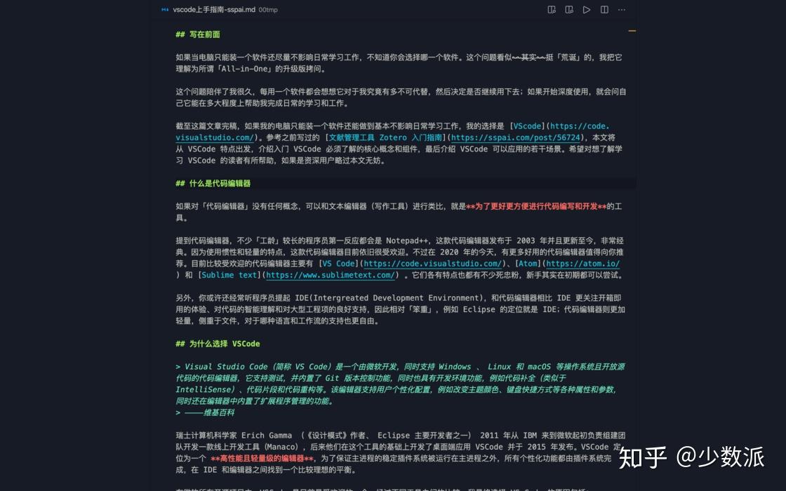 参考之前写过的 文献管理工具 Zotero 入门指南,本入门指南将从 VS Code 特点出发,介绍入门 VS Code 必须了解的核心概念和组件(上篇)以及 5 个 VS Code 实际使用场景(下篇)。希望对想了解和学习 VS Code 的读者能有一点帮助和启发。