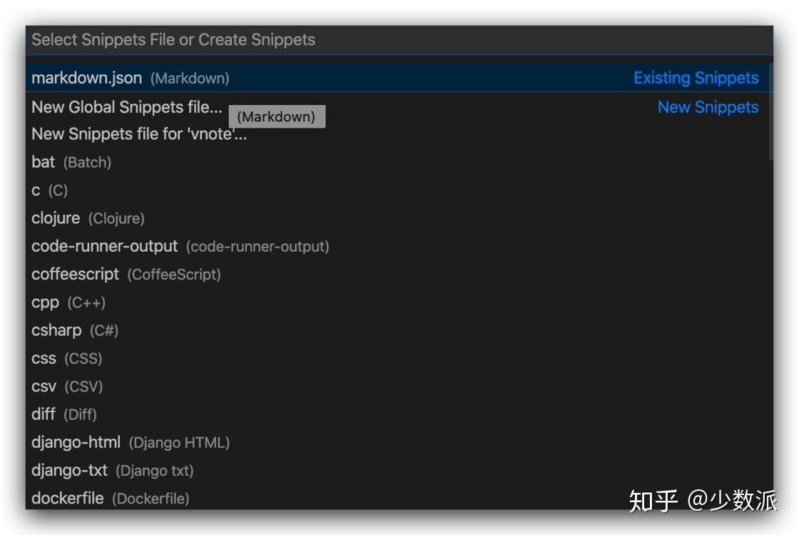 如果想配置自己的代码片段,在命令面板中输入 Configure User Snippets 后会看到语言选项,这里我们以 Markdown 为例,配置内容本身为 json 格式。