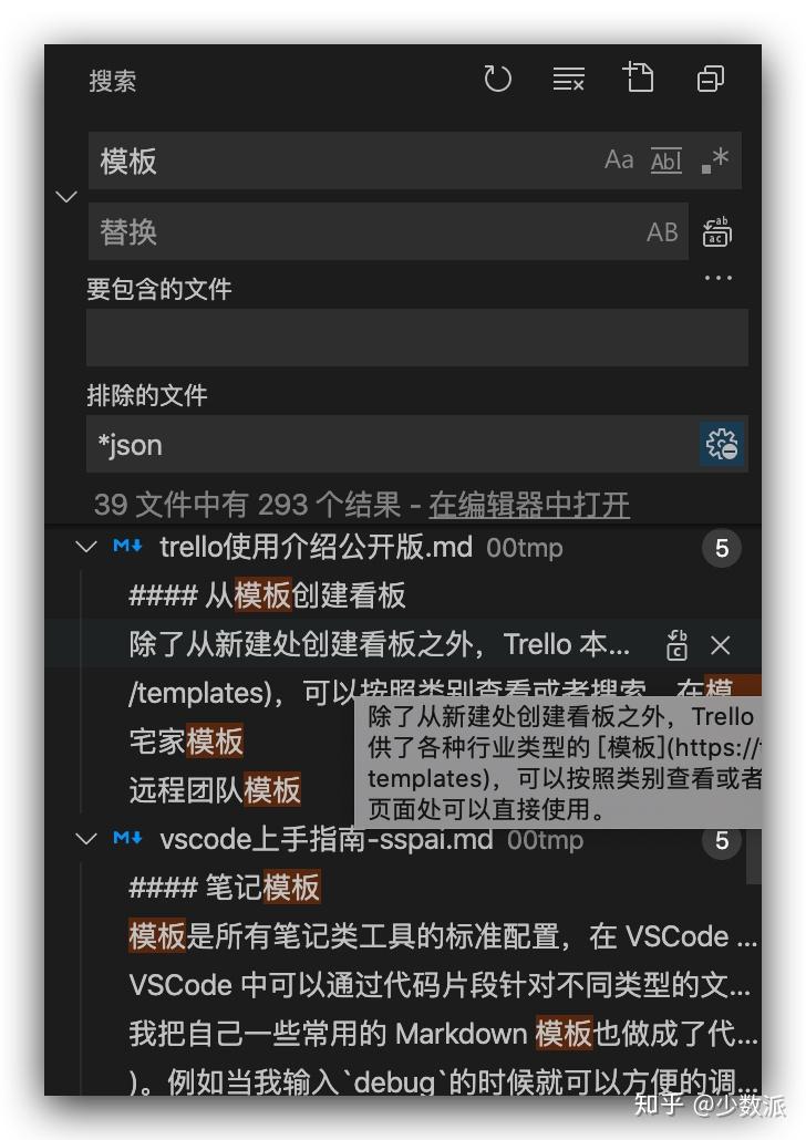 如下图所示,我在一个文件夹内搜索「模板」,它会在结果中显示每个文档中的搜索结果,鼠标放在某一行时会用浮窗形式展示详细内容,点击后会直接打开对应文档并定位在所在行。