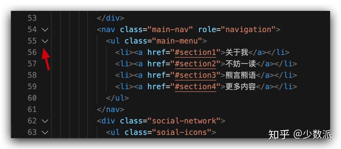 除了代码格式化以外,VS Code 还可以基于语言定义进行代码折叠,即根据语言特性来自动区分哪些部分可以折叠,因此 Markdown 文档同样可以使用代码折叠功能。当鼠标位于行号旁边时,可以被折叠的位置会自动显示向下箭头。