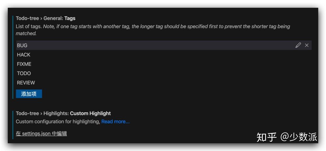 以比较常用的 TODO 插件 Todo Tree 为例,在设置中我们可以指定哪些内容作为标记以及这些标记如何被展示。