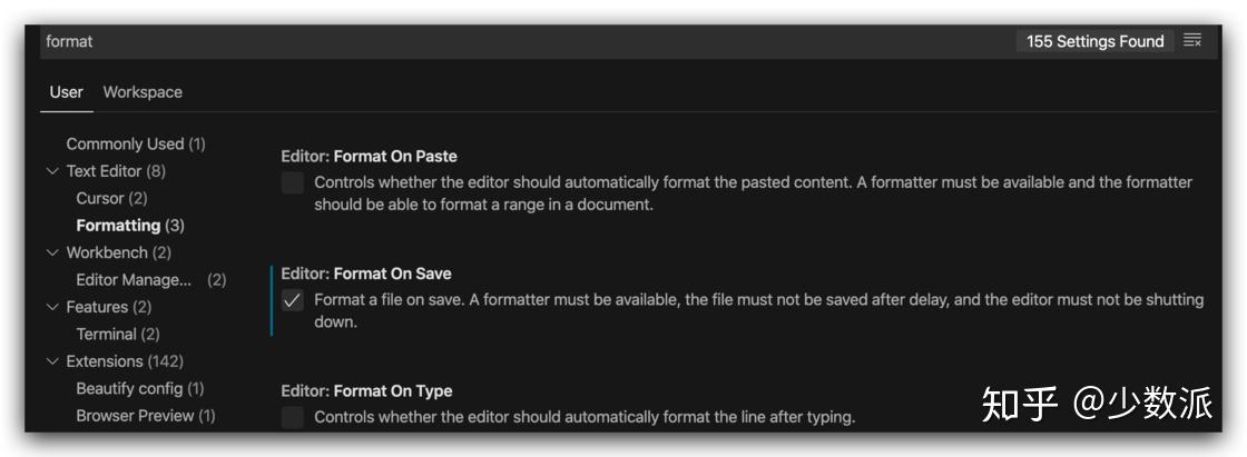 代码格式化是指让各种不规范的代码瞬间按照要求好看起来,VS Code 借助语言插件目前对绝大多数语言都有很好的支持。在设置中我们可以选择何时对代码进行格式化,包括输入粘贴和保存。此外每种语言都可以进一步进行个性化设置。
