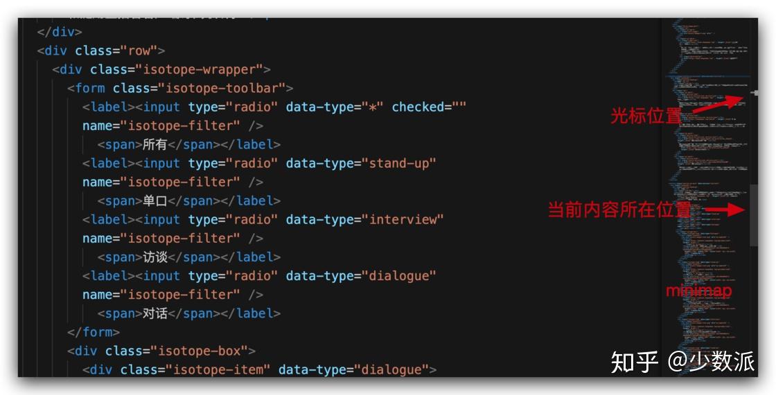 对于较长的代码,如果不习惯使用代码折叠可以开启 minimap 功能。当前页面在小地图中会呈现为灰色,光标所在位置为白色。如果进行文件内搜索时,对应位置会以黄色高亮显示。