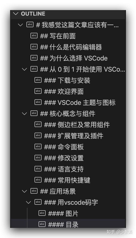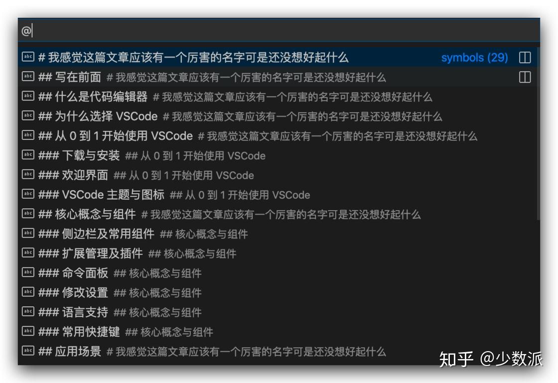 如果你没有忘记上文提到的命令面板,我们还可以利用命令面板的符号跳转功能实现章节定位。符号跳转本身是针对代码设计的,可以快速跳转到一些函数定义和类定义,其实在 markdown 中也十分好用,只需要按下 Command+shift+o 或者按下command+p后输入@, 就可以看到各级标题了。