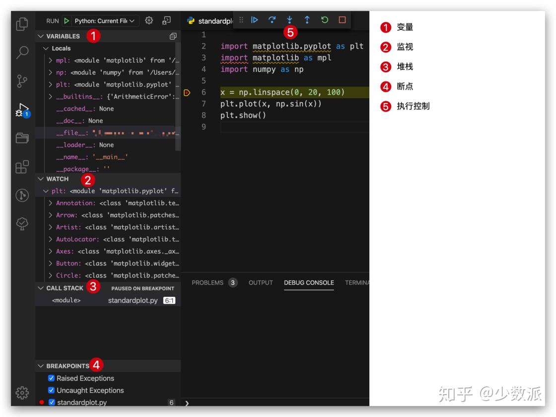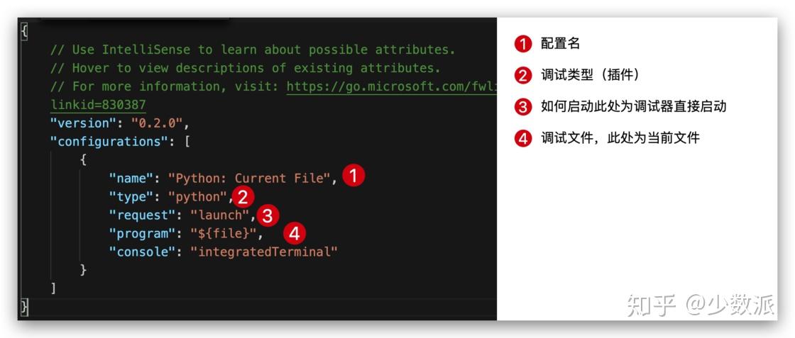 如果想进入调试模式,首先需要点击侧边栏的调制组件打开调试视图,会看到提示打开一个需要被调试的文件。我们以简单的 Python 脚本举例,打开脚本后会自动生成一个名为 launch.json 的调试配置文件。这个文件可以随时修改,定义不同的内容应该如何加载调试。典型的配置如下图所示。