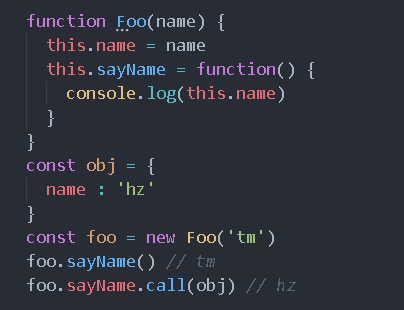 new关键字创建一个foo对象实例 foo对象调用sayName方法时,此时this指向foo实例,输出tm- 在调用