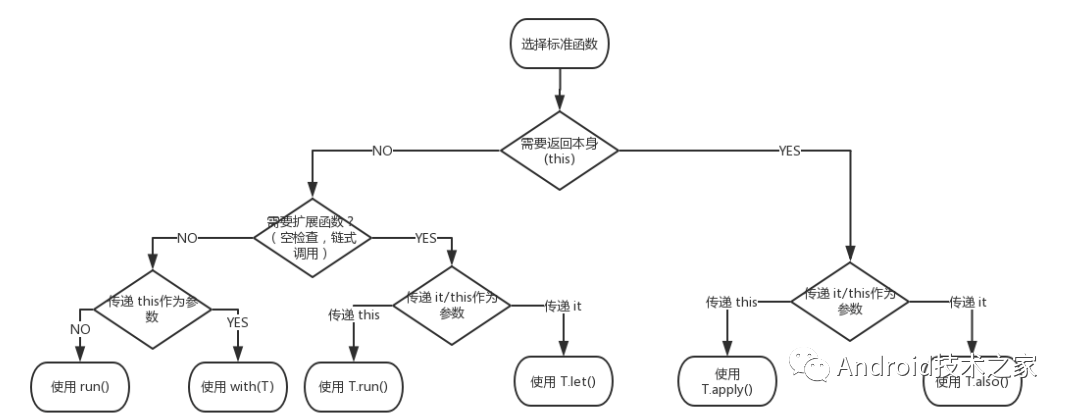 class TestBean { var name: String = "siry" var age: Int = 18 var sex: String = "girl" fun setData(name: String = "lily", age: Int = 18, sex: String = "girl") { }}run函数:函数内使用this代替本对象###返回值为函数最后一行或者return指定的表达式 var result = testBean.run { Log.i("LHD", "run 函数 this = " + this)//this代表当前testBean对象// it run函数无法使用it但可以使用this来指代自己 this?.age = 17 this?.age//返回这行 } Log.i("LHD", "run 的返回值 = $result")let函数:函数内使用it代替本对象返回值为函数最后一行或者return指定的表达式 var result2 = testBean.let { //let 函数可以使用it Log.i("LHD", "it = $it")//it代表当前testBean对象// Log.i("LHD", "let 函数 = " + this)//this代表Mainactivity it?.age = 16//这行其实是在调用setAge函数,如果这行为最后一行,则没有返回值 it?.age//返回这行 } Log.i("LHD", "let 返回值 = $result2")also函数:函数内使用it代替本对象,返回值为本对象 var result4 = testBean.also { it?.age = 14 } Log.i("LHD", "also 返回值 = $result4")takeIf函数:条件为真返回对象本身否则返回null testBean?.age = 18 //age = 18 var resultTakeIf = testBean?.takeIf { it.age > 15//这个条件判断为真返回对象本身否则返回null } var resultTakeIf2 = testBean?.takeIf { it.age < 15//这个条件判断为真返回对象本身否则返回null }