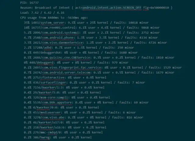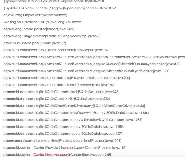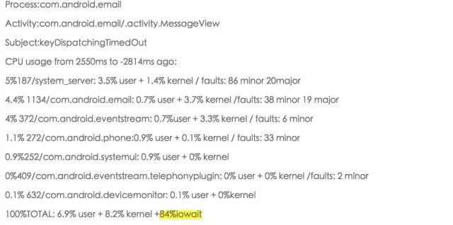 04-01 13:12:11.572** I/InputDispatcher( 220): Application is not responding**:Window{2b263310com.[Android](http://lib.csdn.net/base/android).email/com.android.email.activity.SplitScreenActivitypaused=false}. 5009.8ms since event, 5009.5ms since waitstarted04-0113:12:11.572 I/WindowManager( 220): Input event dispatching timedout sending tocom.android.email/com.android.email.activity.SplitScreenActivity04-01 **13:12:14.123 I/Process( 220): Sending signal. PID: 21404 SIG: 3---****发生**ANR**的时间和生成**trace.txt**的时间**04-01 13:12:14.123 I/dalvikvm(21404):threadid=4: reacting to signal 3 ……04-0113:12:15.872 E/ActivityManager( 220): ANR in com.android.email(com.android.email/.activity.SplitScreenActivity)04-0113:12:15.872 E/ActivityManager( 220): Reason:keyDispatchingTimedOut04-0113:12:15.872 E/ActivityManager( 220): Load: 8.68 / 8.37 / 8.5304-0113:12:15.872 E/ActivityManager( 220): **CPUusage from 4361ms to 699ms ago** ----CPU在ANR发生前的使用情况04-0113:12:15.872 E/ActivityManager( 220): 5.5%21404/com.android.email: 1.3% user + 4.1% kernel / faults: 10 minor04-0113:12:15.872 E/ActivityManager( 220): 4.3%220/system_server: 2.7% user + 1.5% kernel / faults: 11 minor 2 major04-0113:12:15.872 E/ActivityManager( 220): 0.9%52/spi_qsd.0: 0% user + 0.9% kernel04-0113:12:15.872 E/ActivityManager( 220): 0.5%65/irq/170-cyttsp-: 0% user + 0.5% kernel04-0113:12:15.872 E/ActivityManager( 220): 0.5%296/com.android.systemui: 0.5% user + 0% kernel04-0113:12:15.872 E/ActivityManager( 220): **100%TOTAL: 4.8% user + 7.6% kernel + 87% iowait**04-0113:12:15.872 E/ActivityManager( 220): **CPUusage from 3697ms to 4223ms later**:-- ANR后CPU的使用量04-0113:12:15.872 E/ActivityManager( 220): 25%21404/com.android.email: 25% user + 0% kernel / faults: 191 minor04-0113:12:15.872 E/ActivityManager( 220): 16% 21603/__eas(par.hakan: 16% user + 0% kernel04-0113:12:15.872 E/ActivityManager( 220): 7.2% 21406/GC: 7.2% user + 0% kernel04-0113:12:15.872 E/ActivityManager( 220): 1.8% 21409/Compiler: 1.8% user + 0% kernel04-0113:12:15.872 E/ActivityManager( 220): 5.5%220/system_server: 0% user + 5.5% kernel / faults: 1 minor04-0113:12:15.872 E/ActivityManager( 220): 5.5% 263/InputDispatcher: 0% user + 5.5% kernel04-0113:12:15.872 E/ActivityManager( 220): **32%TOTAL: 28% user + 3.7% kernel**