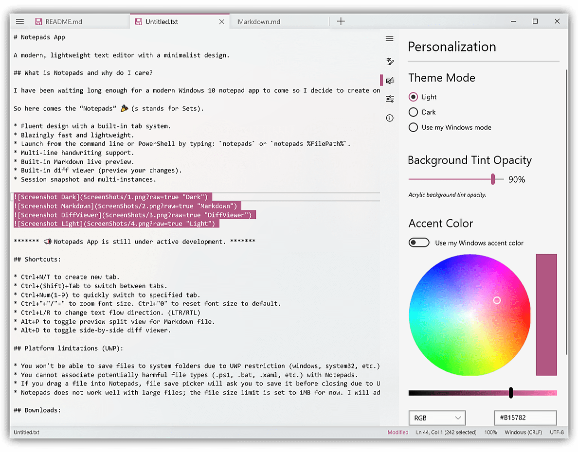 2、Notepads:一款基于 C# 开发的 UWP 文本编辑器。该记事本应用是由一位国人开发,采用了 Fluent Design。轻便、美观,打开速度飞快,支持 Markdown 预览、文件更改前后对比和多标签页。它没有 VS Code 或是 Sublime 那么强,但是完全可以代替 Windows 系统自带的笔记本应用
