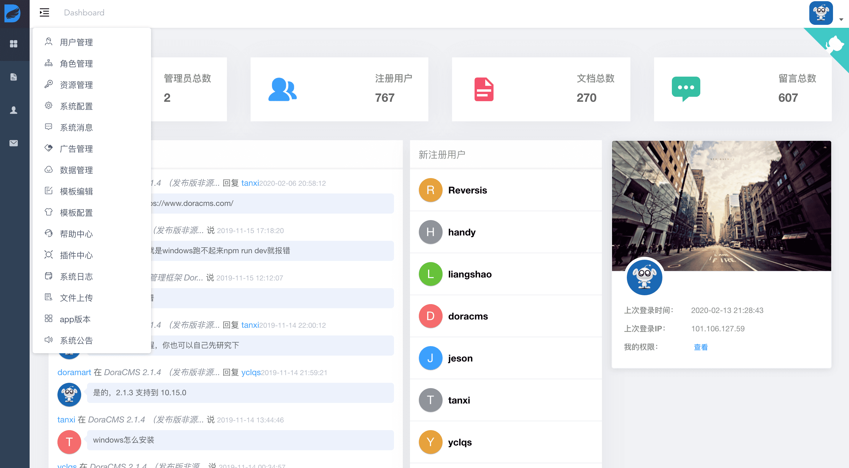 18、DoraCMS:基于 Nodejs + eggjs + Mongodb 编写的内容管理系统。项目结构清晰、易于拓展,适合前端开发工程师做二次开发