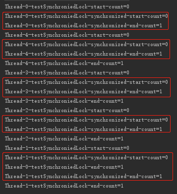 System.out.printf("%s-testSynchroniedLock-synchronized-end-count=%s\n", Thread.currentThread().getName(), count);