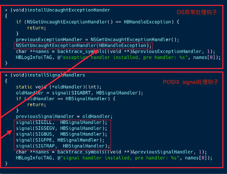 Objective-C 异常和 POSIX signal 的处理理钩子,在发生崩溃的时候可以通过钩子函数记录崩溃的信息。