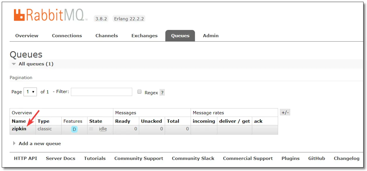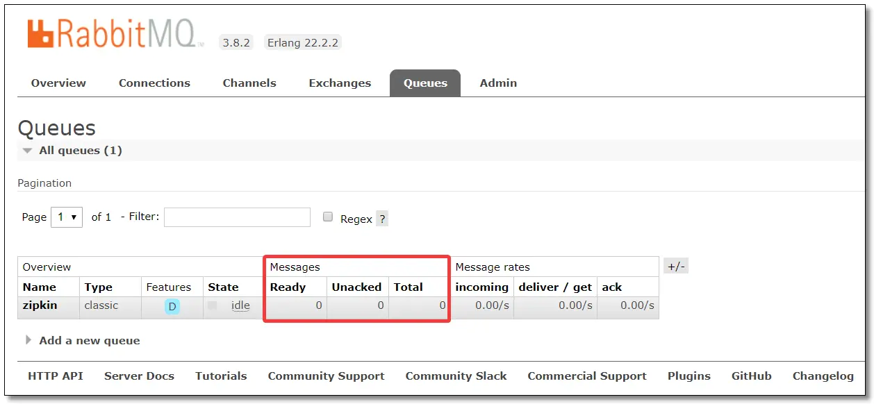 访问:http://192.168.10.101:15672/#/queues 可以看到已经创建好了 zipkin 队列。