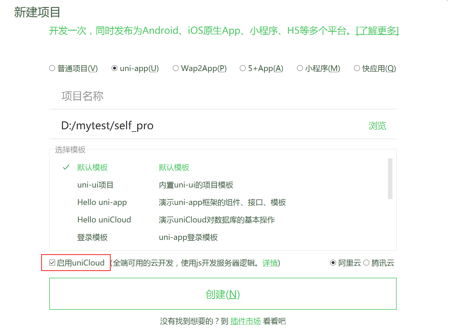 创建新的uniapp项目,记得勾选启用uniCloud,我选用的阿里云