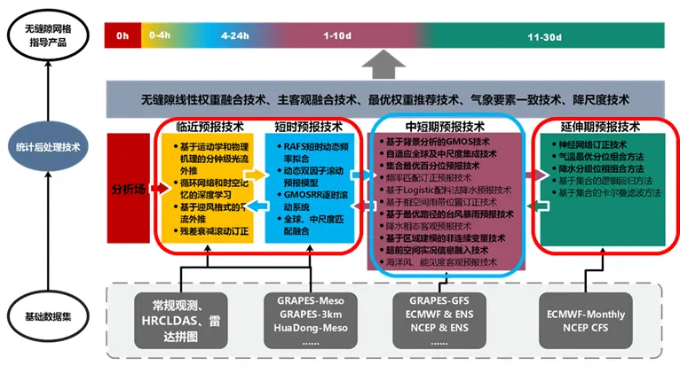 在全国多源观测资料以及多中心多尺度数值模式等大数据基础上,利用先进的人工智能等后处理技术和预报员主客观融合预报技术等,创新临近、短时、短中长预报无缝隙精细化智能网格降水,空间分辨率达到5公里×5公里,时间最高分辨率达到逐1小时。为水文预报提供无缝隙精细化的前端降水预报。