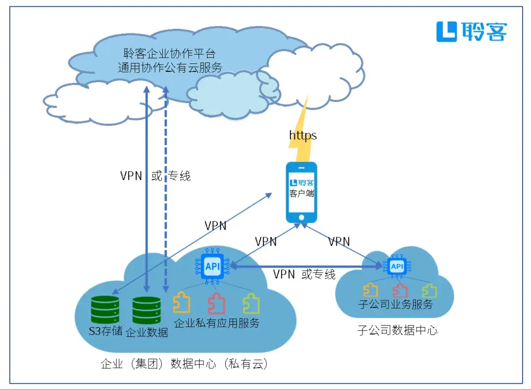 聆客平台将即时通讯、群组、动态、服务号、公告、日程、签到、项目等通用协作服务搭建在公有云资源上,通过公有云提供服务,所产生的基础协作数据,会推送给企业进行私有化存储。为了保证企业稳态发展,原有的传统业务系统仍然可以在原来的环境中继续运行,聆客平台通过与这些传统业务进行必要的对接、提供新型的业务服务,打造企业专属的协作平台,促进企业高效的协作协同,支撑企业实现敏态发展。对于聆客平台中嵌入的这些涉及更多企业敏感业务数据的对接服务,聆客平台支持将其部署在客户的私有化环境或VPC中,所产生的数据也在客户的自主管控之下。