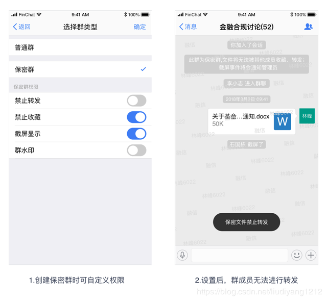 保密群、保密文件,可以为敏感的信息创建保密群聊,相关的聊天数据无法被转发、分享,截屏的时候会出现水印,确保聊天会话安全。而对于一些敏感文件,可以开启保密文件能力,可以为文件设置访问密码、过期时间、访问留痕等等,让文件即便转发出去,也可以受控查看、转播。