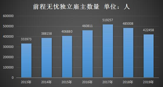 相关资料显示,前程无忧的雇主从2013年的33万人增长到了2017年的51万人,而近些年这个数字则一路下滑。2018年前程无忧雇主数量剩下48万人,而在过去一年前程无忧的雇主数量更是减少了6万人之多,剩余42万人。