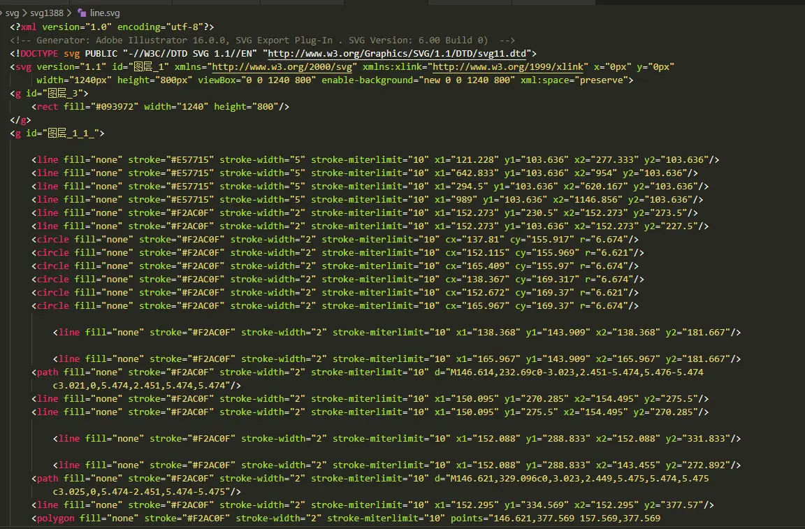 1、先看看我们要用的svg的文件代码,原先我是整个文件这样子引入到vue里面,但是图片不显示出来。后面一步一步的检查测试后才发现不能写有下面的这个声明。