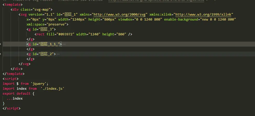 东扯西扯的一堆,接下来我们看看vue里面的直接用法吧。 因为要用的svg文件有好几个,但是赋值什么的方法应该是一样的,所以我就把js文件单独抽出来了。顺便补补svg一些元素属性的含义。