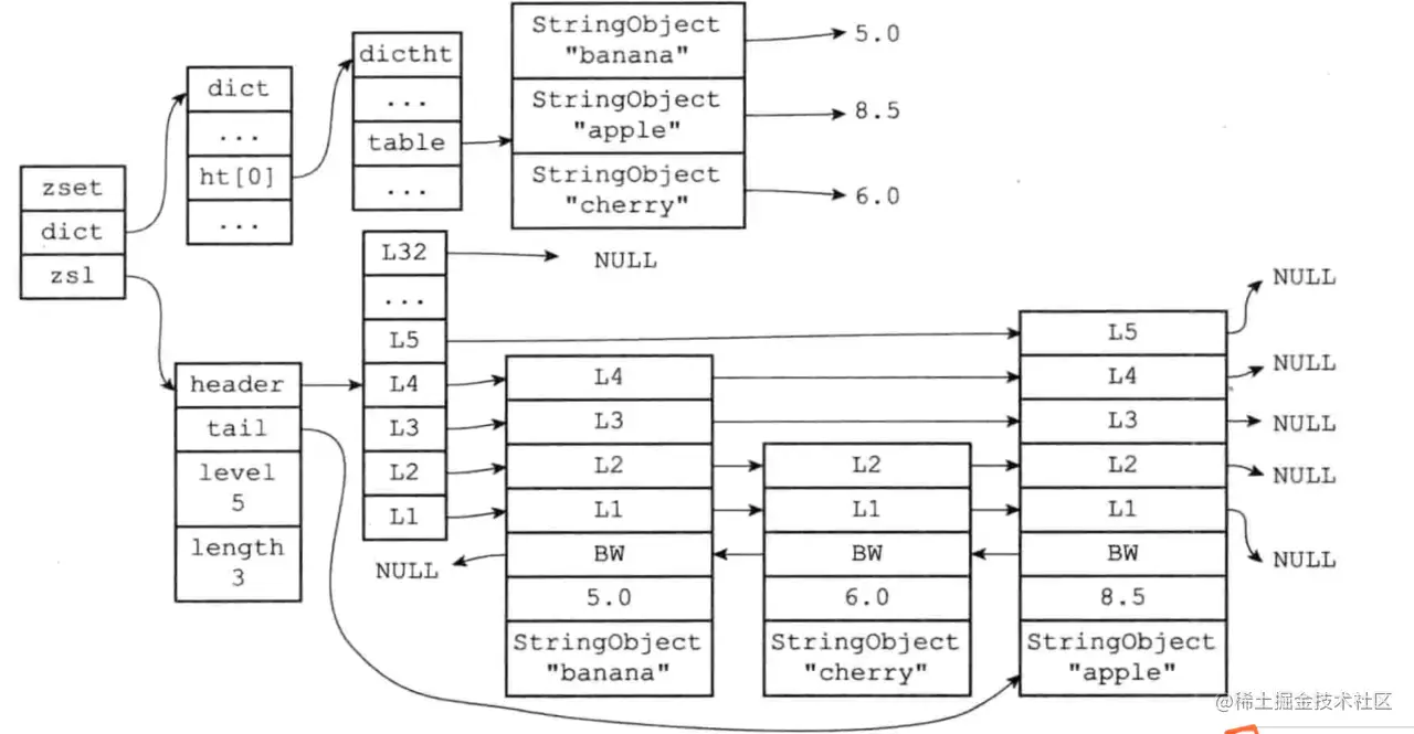 // 两种数据结构通过指针共享元素成员和分值,不会浪费内存 typedef struct zset { zskplist *zsl; //跳跃表,方便zrank,zrange dict *dict; //字典,方便zscore }zset; 复制代码