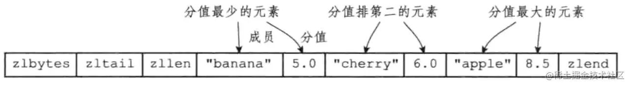 ziplist:每个元素使用两个紧挨在一起的节点表示,第一个表示成员,第二个表示分值。分值小的靠近表头,分值大的靠近表尾