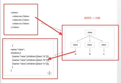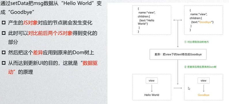 WXML -> Js对象 -> 真正DOM树 -> WebView界面(渲染线程渲染) -> 数据发生变化 -> 逻辑层提供变化数据 -> JS对象进行diff算法对比 -> 反映到真正DOM树 -> 更新UI