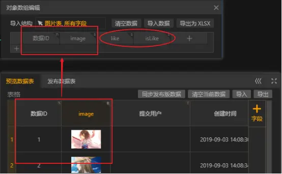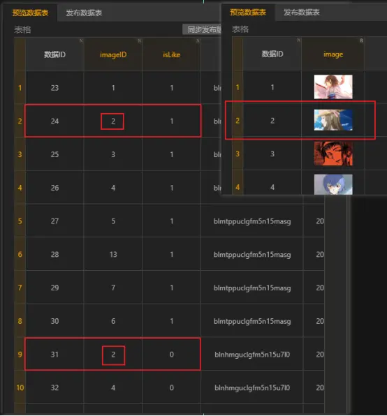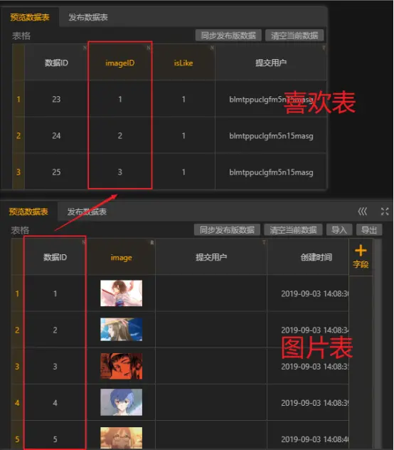 例如下图,图片表中数据ID字段为唯一标识字段,我们要在喜欢表中引用图片表的数据时,并不是将图片直接添加在喜欢表中,而是将图片的数据ID保存在喜欢表的imageID字段中。反之,通过这个imageID我们可以在图片表中找到唯一确定的图片数据。