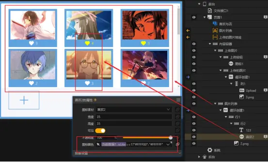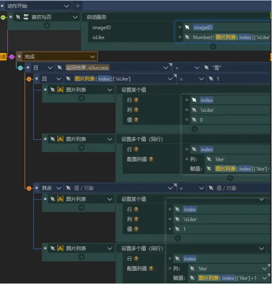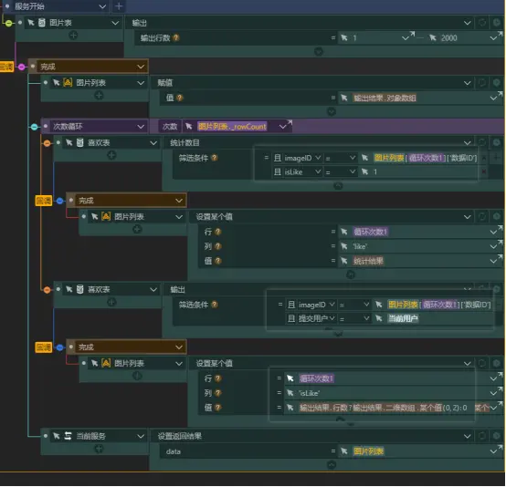 接下来我们使用一个循环语句遍历对象数组的每一行数据。每次循环中我们先统计喜欢表中imageID字段等于该行图片数据ID且islike字段为1的记录条数,将统计结果填到该行的like中,然后再从喜欢表中输出image字段等于该行图片数据ID且提交用户为当前用户的记录,根据统计结果设置islike的值。这里使用了一个三元表达式,如果输出行数是0行就表示当前用户没有点赞过该图片直接赋值为0。如果有输出记录,那么输出结果中的islike就可能为1(用户点赞过)也可能为0(用户点赞过又取消了),这里我们不需要再进行判断而将其直接赋值到对象数组中即可。最后我们将对象数组“图片列表”返回到前台。