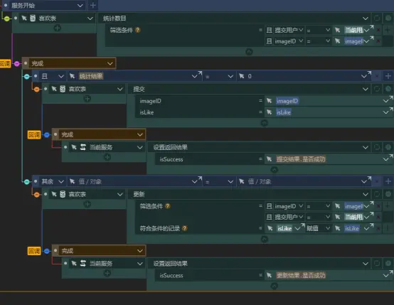 喜欢与否服务用于用户对图片的点赞状态发生改变时,其接收参数就是图片的ID和用户当前对图片的点赞状态。首先从喜欢表中统计提交用户为当前用户且image字段为所传图片的记录条数,如果为0说明用户对该图片没有点赞过,就直接将接收参数提交到喜欢表中,如果统计结果不为0则将接收参数更新到喜欢表中。