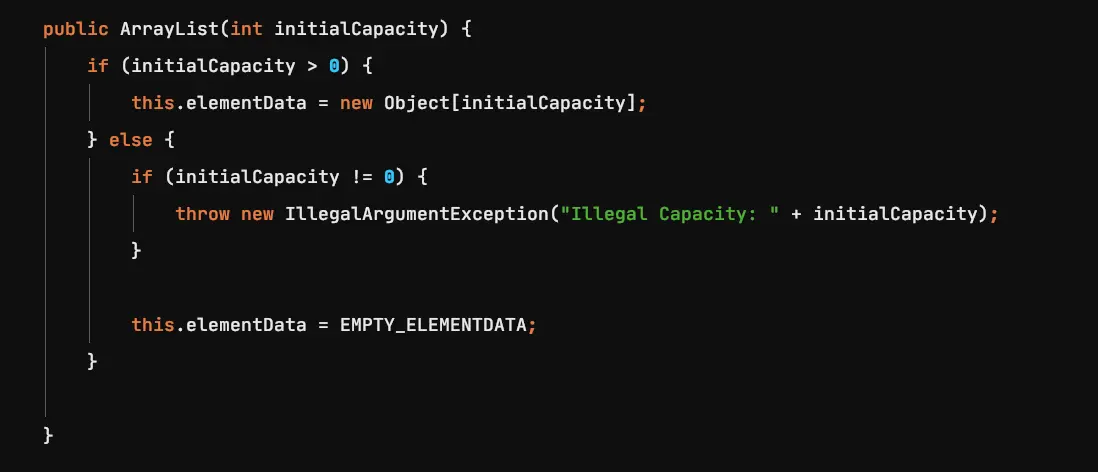 当使用有参构造函数 new ArrayList(initCapacity) 时,如果 initCapacity 小于等于 0 ,则默认数组大小为 0 的数组。