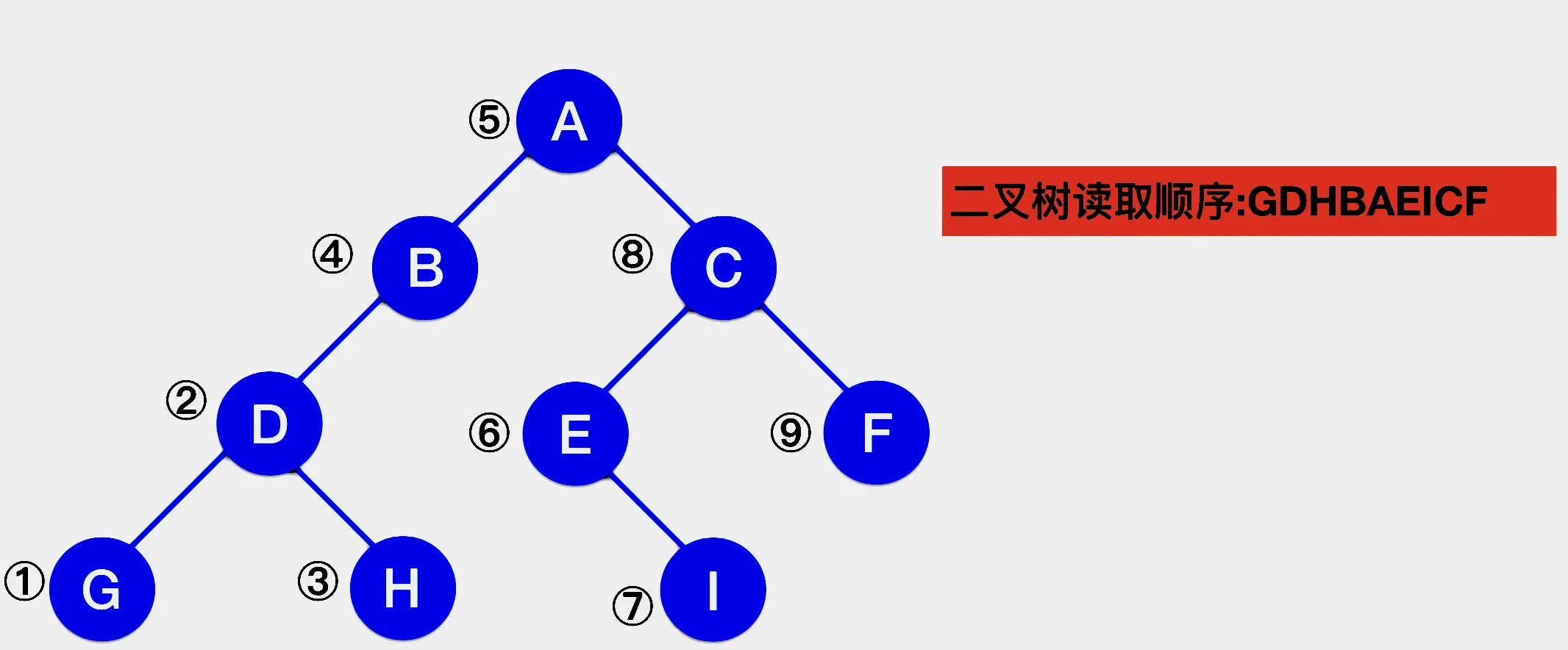 二叉树的遍 Traversing binary tree)是指的从根结点出发,按照某种次序依次访问又树中所有结点,使得每个结点被访问一次且仅被访问一次,二叉树遍按照遍历左子树原则查找,始终查找根结点的左子树,查找不到的时候递归结点的右子树继续查找左子树