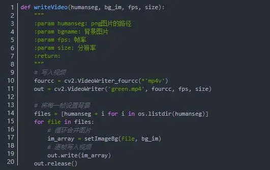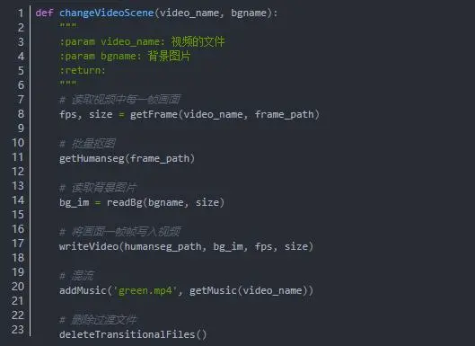抠取人物之后,就需要读取我们的场景图片了,在上面的例子中背景都是静态的,所以我们只需要读取一次场景。在读取场景之后我们切换每一帧画面的场景,并写入新的视频。