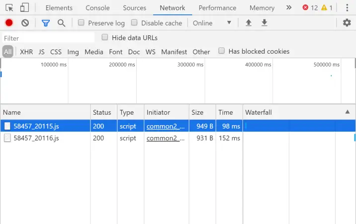 然后分析该网页,我们发现改变相应的年月网页的 URL 并没有发生改变,这说明网页上的数据是动态加载的。我们打开 Chrome 浏览器的DevTools,再改变年月,发现该页面动态加载了一个 js 文件。