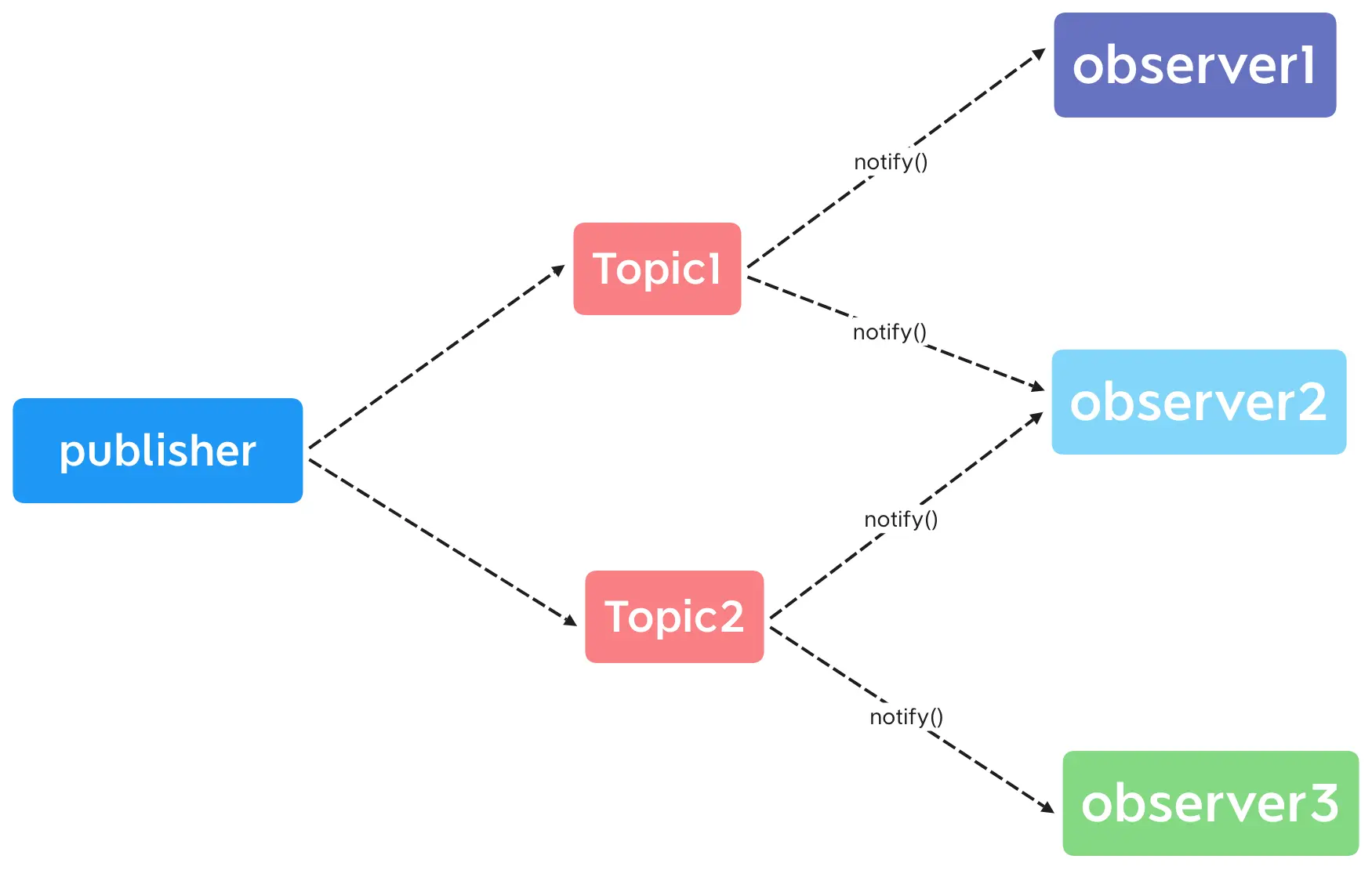 发布/订阅模式和观察者模式最大的区别就是,发布者和订阅者并不会直接进行通信,而是交给一个消息中间件——消息代理(message broker)。