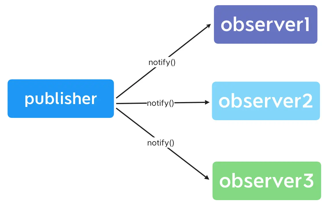 在观察者模式中,多个观察者监听同一个目标对象。当目标对象的状态发生改变的时候,通知所有观察者,进行更新操作。 它们之间是直接进行通信的,由发布者直接通知观察者进行更新。