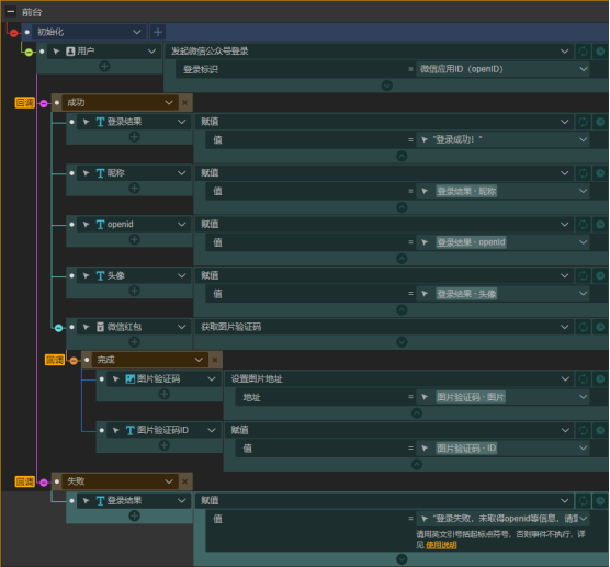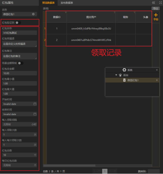 红包组件是后台组件,所有领取红包的用户会被记录在数据表中,包括领取者的openID、昵称、头像、订单号和领取金额。另外我们可以在左侧对红包进行详细的配置,其中总金额,最大值与最小值为必填项。