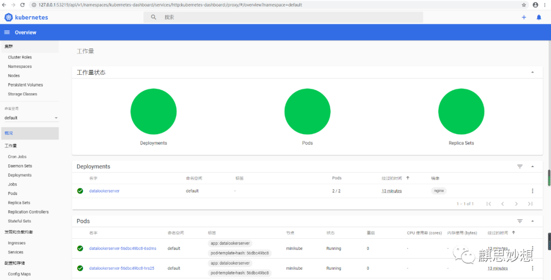 使用 minikube dashboard 命令,可以打开网页来对单机集群进行监控