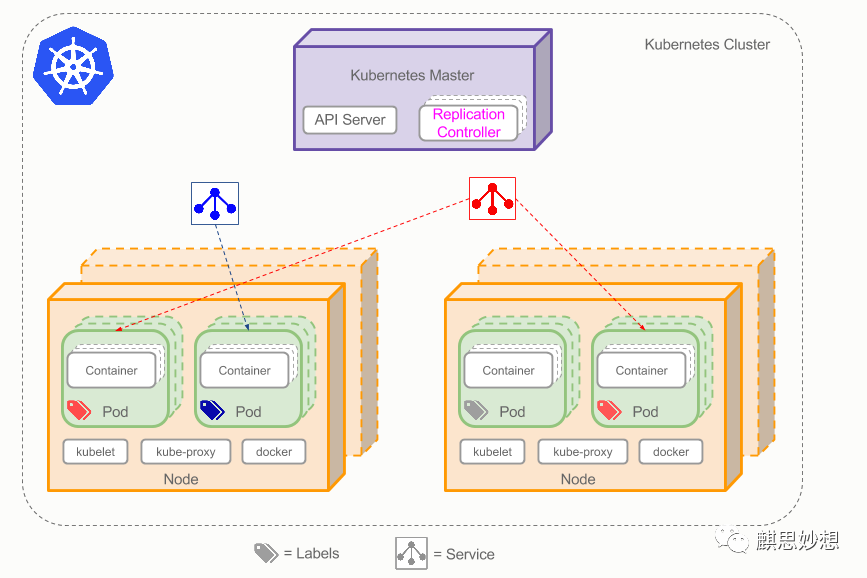 上图可以看到如下组件,使用特别的图标表示Service和Label: