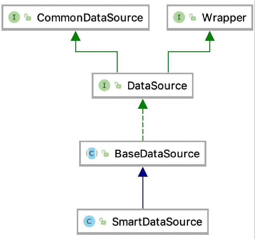 上图为 SOFATracer 中 DataSource 代理类实现的类继承结构体系;可以看出,SOFATracer 中自定义了一个 BaseDataSource 抽象类,该抽象类继承 javax.sql.DataSource 接口,SmartDataSource 作为 BaseDataSource 的唯一子类,也就是 SOFATracer 中所使用的代理类。所以如果你使用了 sofa-tracer-datasource-plugin 插件的话,可以看到最终运行时的 Datasource 类型是 com.alipay.sofa.tracer.plugins.datasource.SmartDataSource。