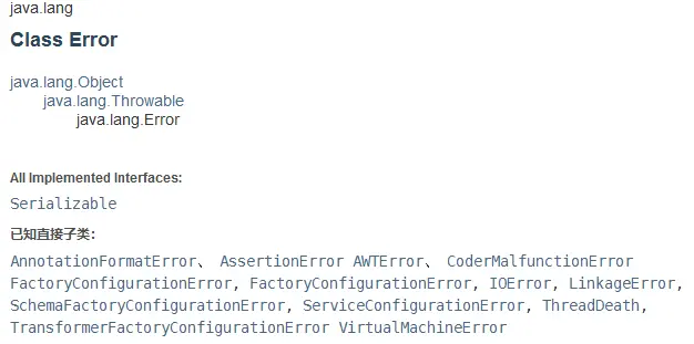 下图是java.lang包下的Error类(图为jdk1.8的API文档)